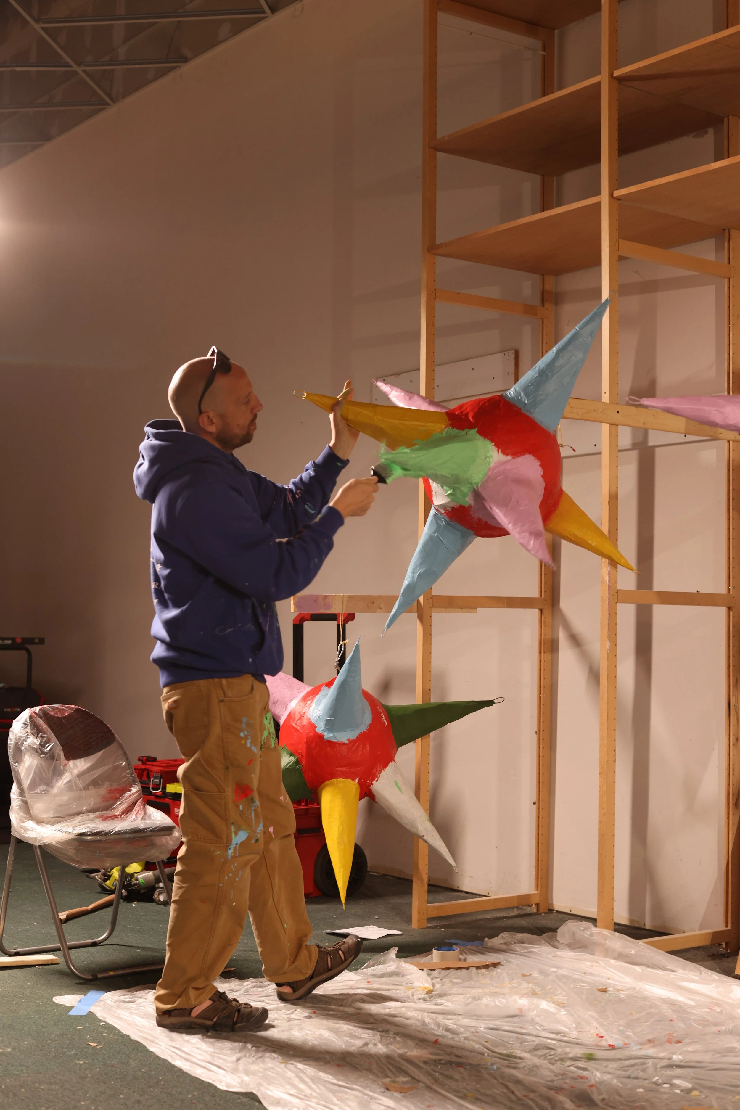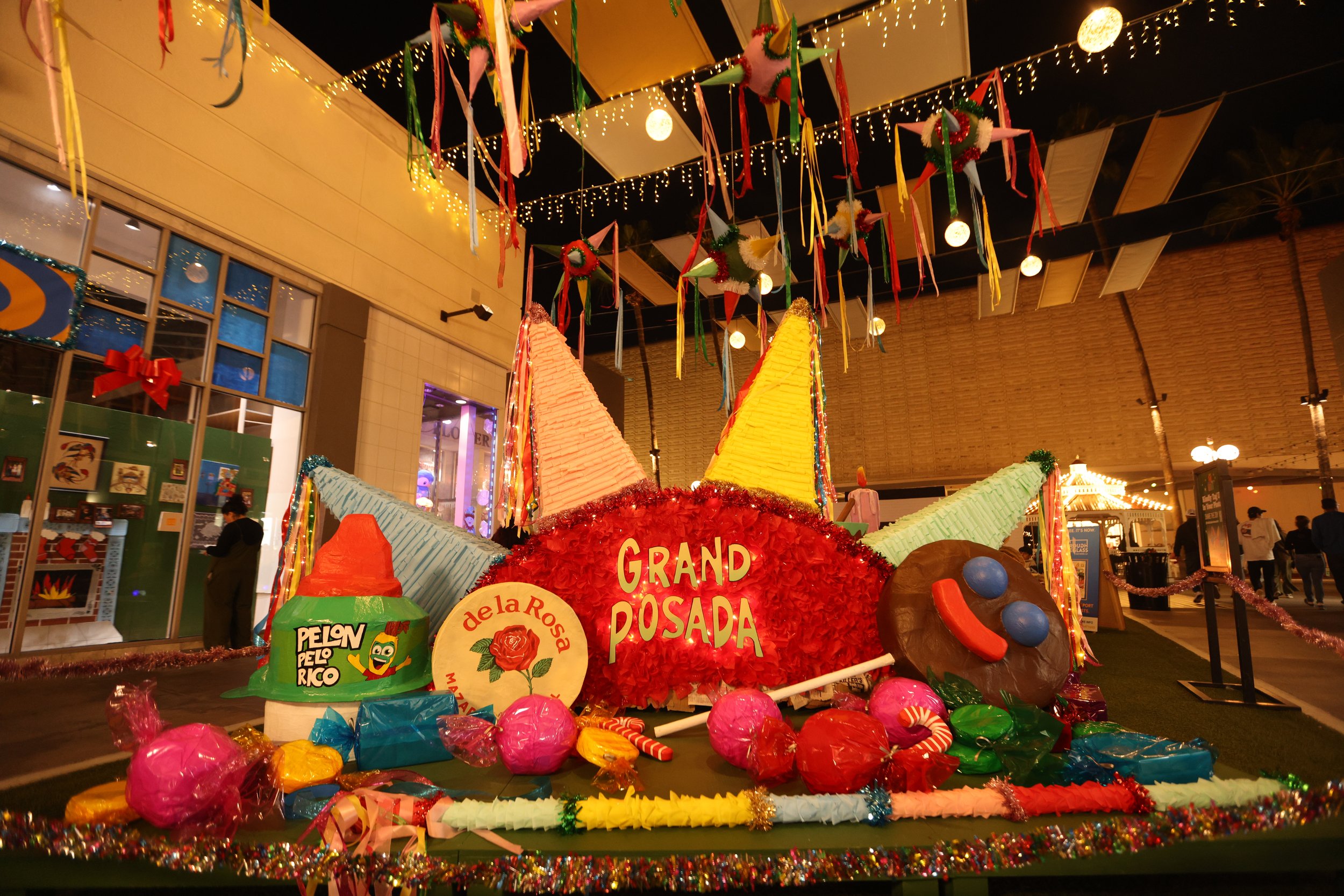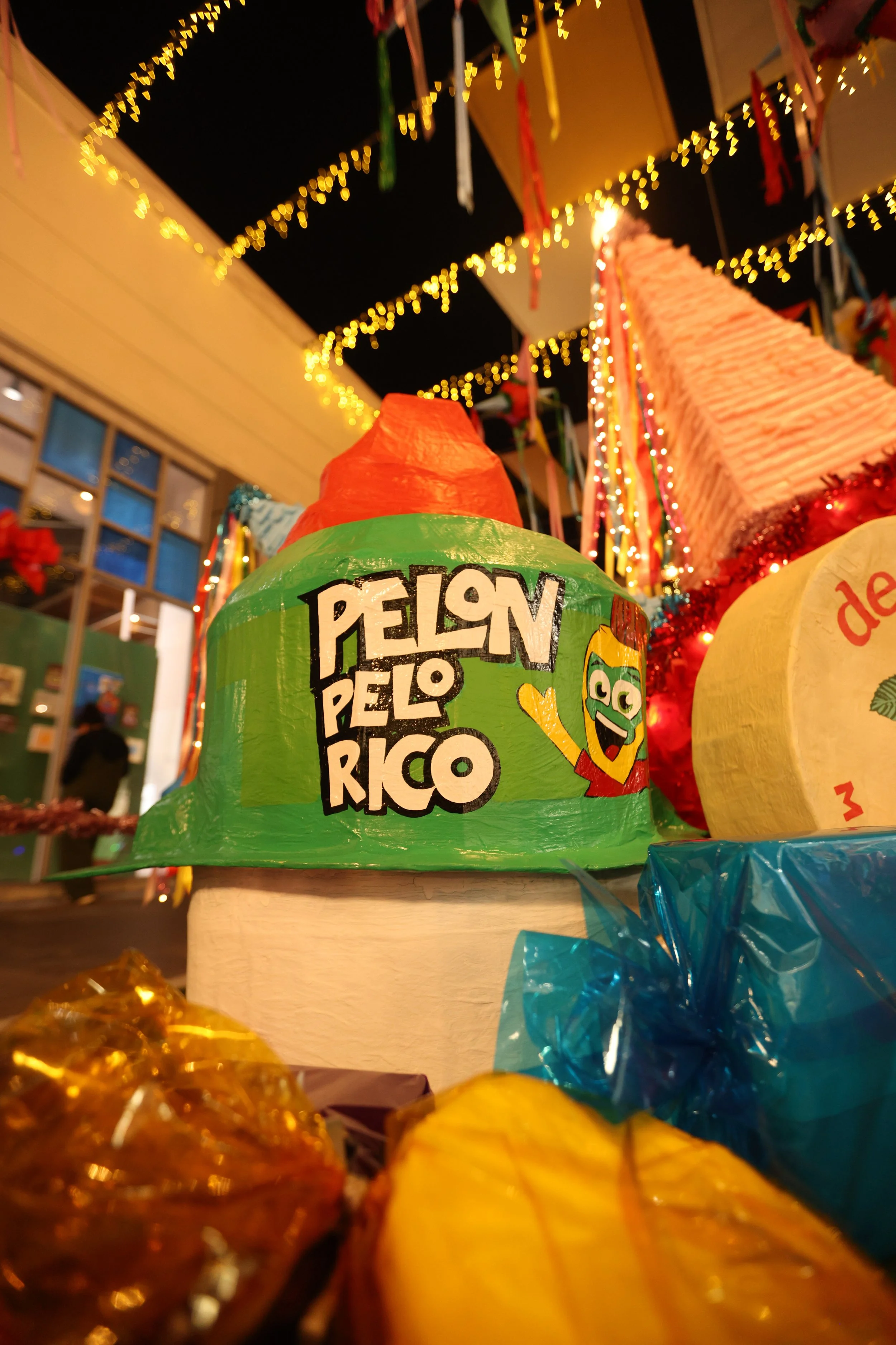 Ten hanging piñatas filled the space to recreate the atmosphere of a traditional posada celebration. A 12-foot half-piñata sculpture surrounded by oversized candy sculptures referenced the sweets many of us grew up eating — including Pelón, Masapan, and Paleta Payaso.