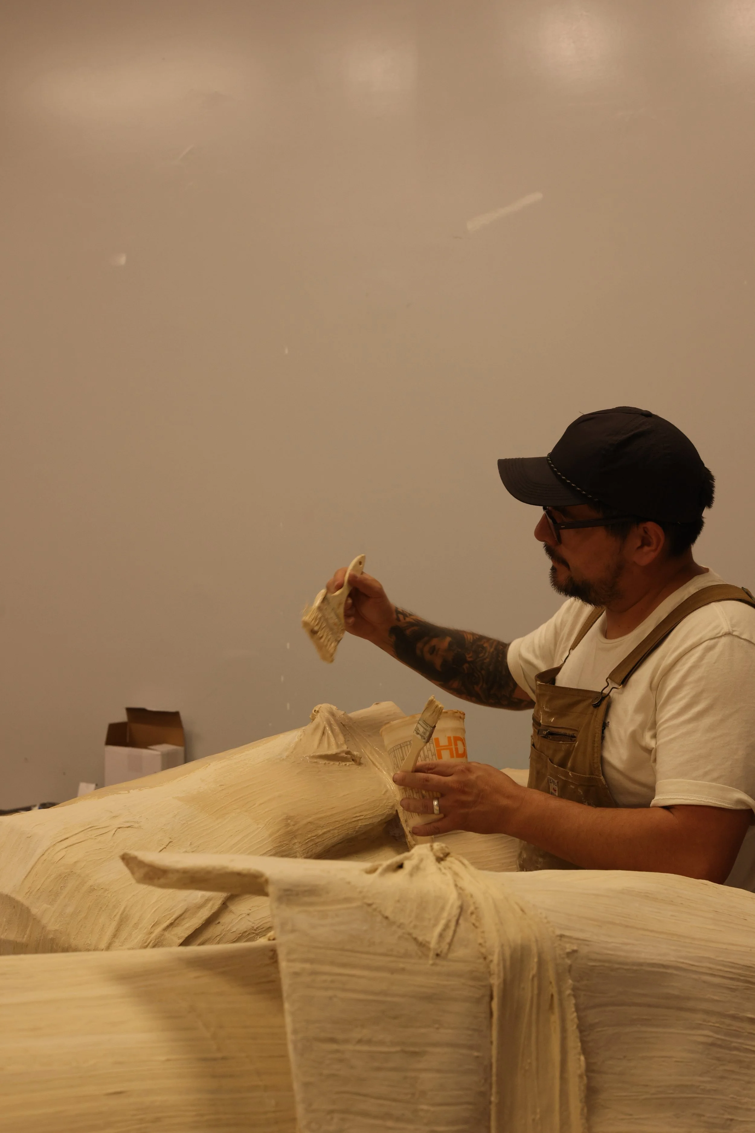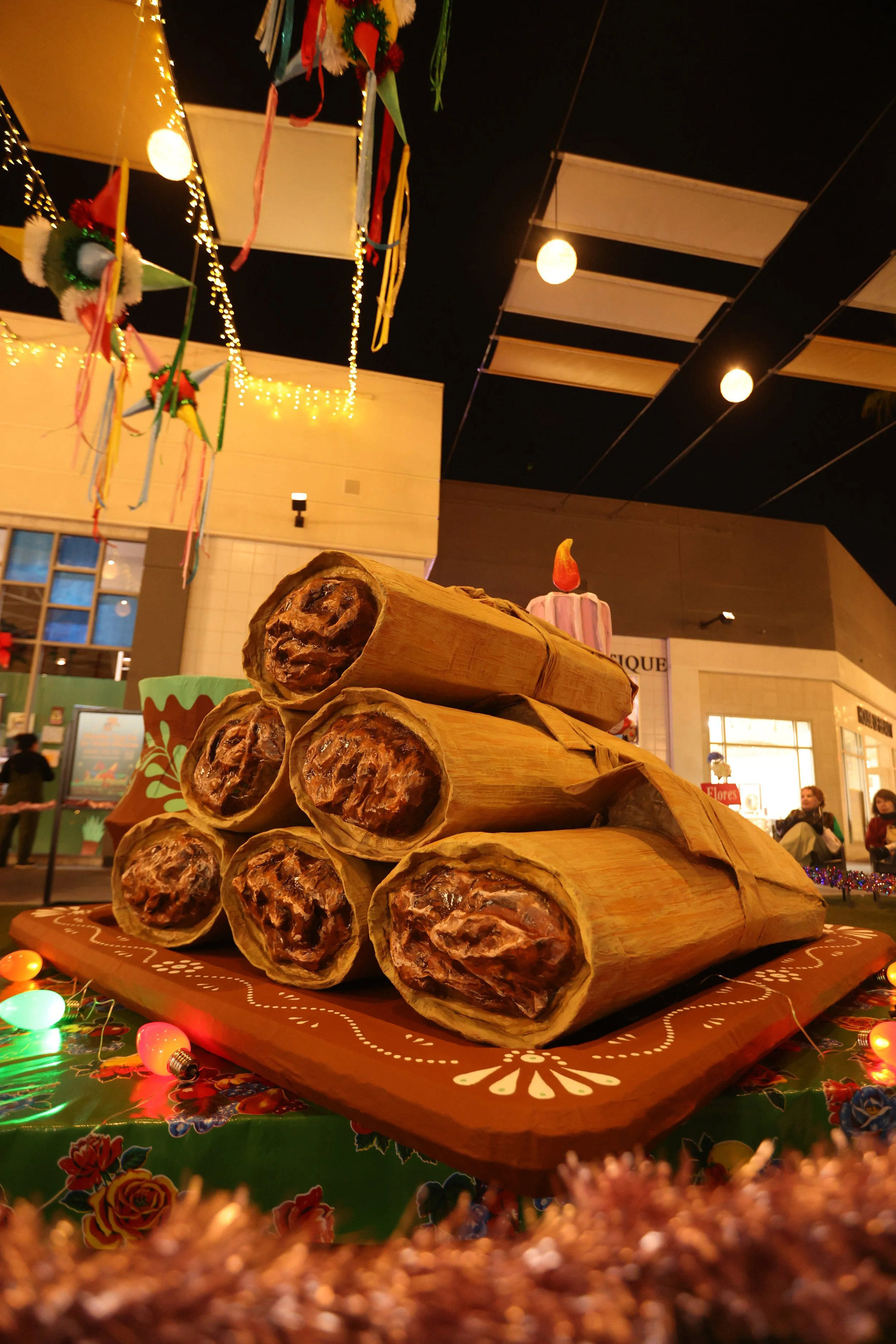 At the center of the installation was an oversized 8-foot plate of tamales paired with a large champurrado cup, placed on a short table covered with the traditional Mexican tablecloth many of us grew up seeing in our homes.